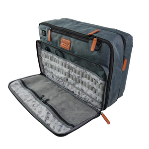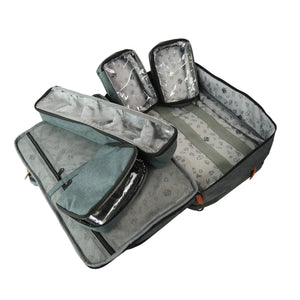 Este modelo también cuenta con un gran bolsillo frontal (45x21 cm) que se abre completamente con en un lado 2 redes de almacenamiento con cremallera y 2 bolsillos planos, y en el otro lado varias presillas elásticas que permiten guardar pequeños artículos de cuidado: pinzas, tijeras, linterna, termómetro, vendas, bolígrafos, etc.