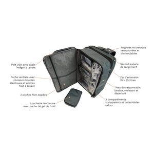 Su espacio principal es modular y contiene 4 compartimentos extraíbles con cremallera (fijados con velcro): 3 transparentes para identificar rápidamente el contenido y 1 aislante, provisto de su bolsillo reutilizable para gel frío, para introducir hasta 20 ampollas.