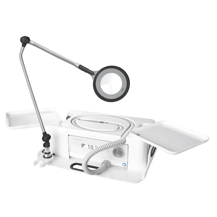 - Provides space for the PODOLOG CIRCLE S mobile magnifying lamp and an extension cord and features integrated storage compartments made of impact-resistant, hygienic, and easy-to-clean ABS plastic. Its compact size makes it easy to transport anywhere.